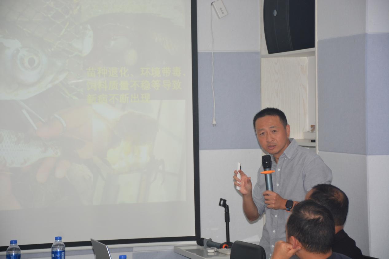 在銷(xiāo)售團(tuán)隊(duì)作完工作匯報(bào)后,公司技術(shù)顧問(wèn)袁圣老師為參會(huì)人員作了精彩的技術(shù)報(bào)告。袁老師從全國(guó)水產(chǎn)養(yǎng)殖普遍存在的問(wèn)題入手,不斷細(xì)化,用科學(xué)的數(shù)據(jù)和大量的現(xiàn)場(chǎng)診斷實(shí)例,為大家講解了養(yǎng)殖中存在的問(wèn)題和常見(jiàn)疾病的診療方法。